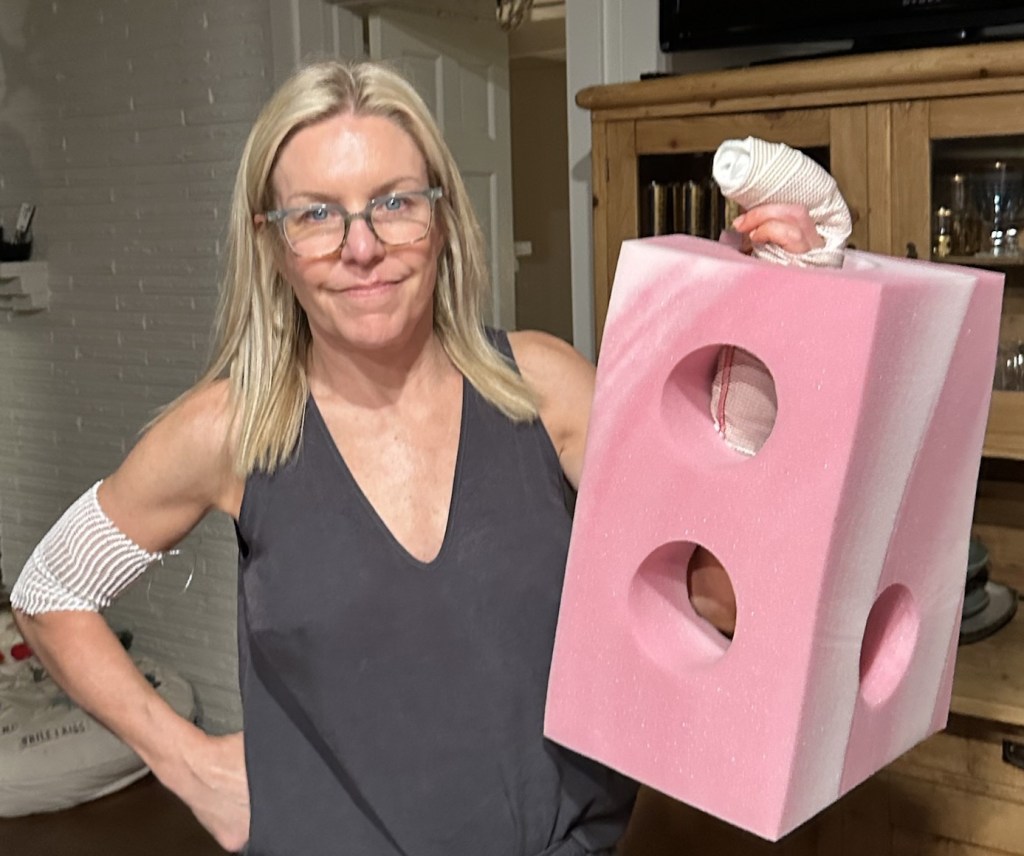 After four days, I was discharged and referred to the orthopedic hand specialist. She informed me I had a serious tendon infection requiring surgery. Opening my hand and “washing out” the imbedded infection was indicated and she scheduled surgery the following morning. I got the surgery at another hospital and came home with the most gigantic, Lego-like block to keep it elevated. It’s so bizarre I have to show you.